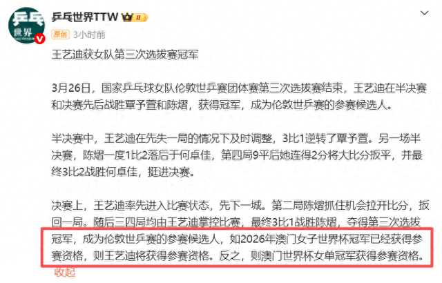 2026-04-04王艺迪世乒赛候选人身份引规则争议距离伦敦世乒赛团体赛开赛仅剩一个月,国乒内部围绕参赛资格的争夺进入白热化阶段。3月26日结束的女队第三次选拔赛中,29岁的王艺迪以3比1战胜陈熠夺... -