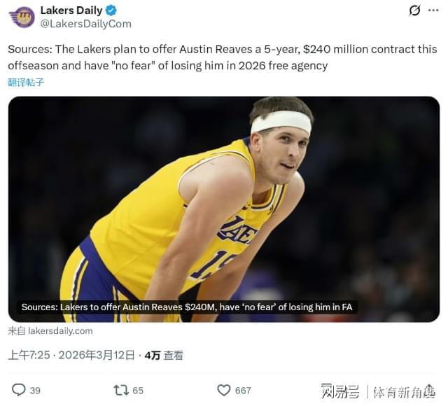 2026-04-01湖人计划为里夫斯送上5年2.4亿顶薪合同 希望交易洛杉矶湖人队在休赛期的运作进入关键阶段,据权威记者Ashish Mathur独家披露,球队正积极筹备一份为期5年、总价值达2.4亿美元的顶薪续约合同,目标直指... -