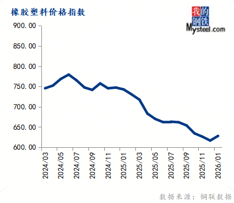 1月份橡胶塑料价格指数为628.16,环比上涨1.86%,同比下跌15.43%。