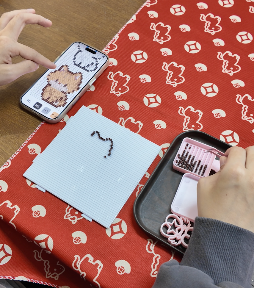 在广州一家名为“万物皆可拼”的拼豆体验店内,下午3点刚过,十余张工作台已座无虚席。顾客们低头专注地用镊子将一颗颗彩色塑料豆嵌入模板,有人拼的是喜欢的小物件,有人复刻童年动画片中的经典形象,还有人在为朋友婚礼定制手作拼豆礼物。店员小麦一边熨烫成型的作品,一边对记者说:“高峰期我们几乎一直在熨,根本停不下来。”