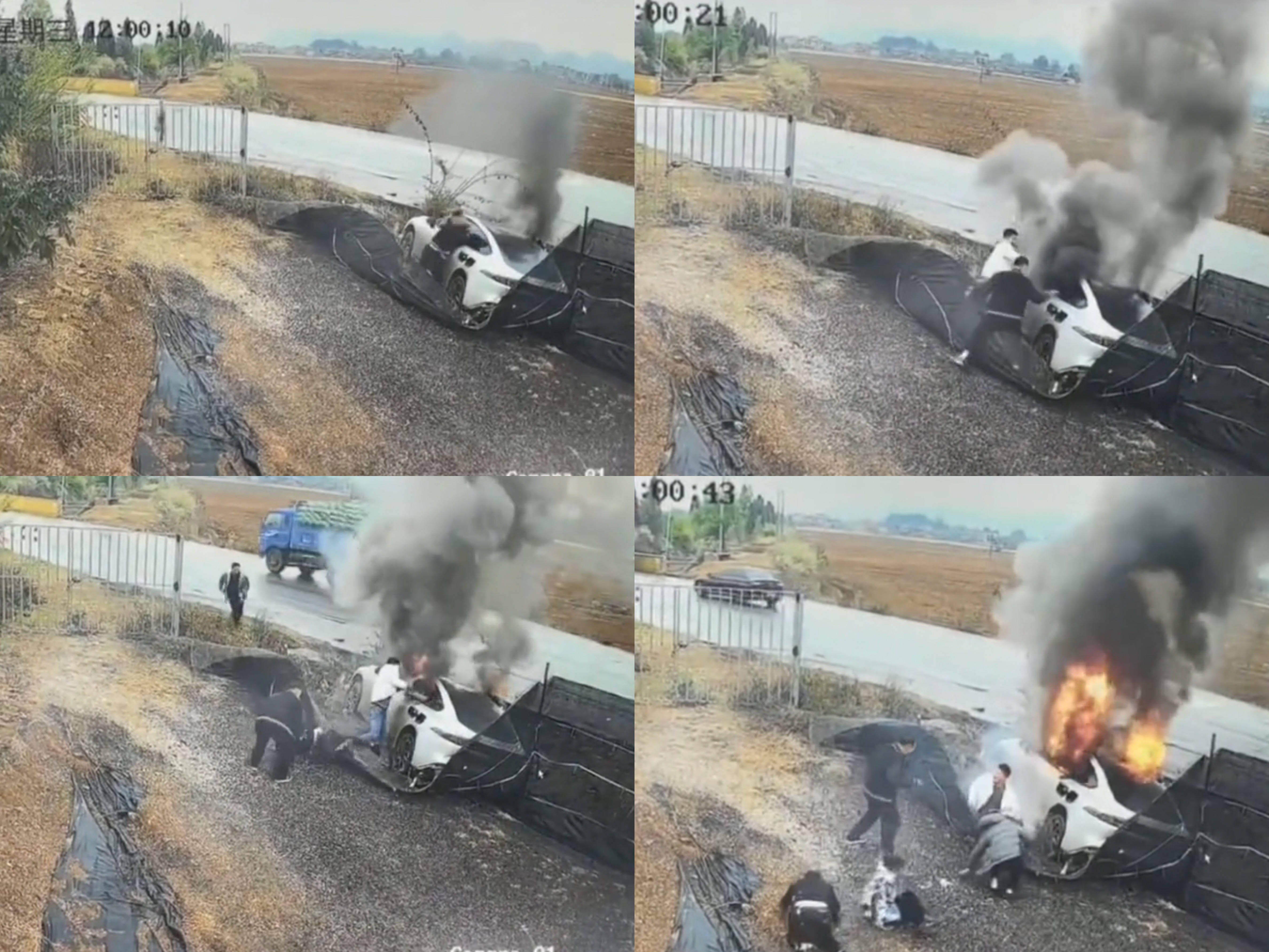 随后一名白衣男子从远处飞奔而来,该男子和司机从路旁搬起石头砸向车窗。12时0分20秒,车窗砸开后,大量黑烟从窗户冒出,并伴随起火;12时0分28秒,后排第一名乘客救出;当第二名乘客被拉出时,已可见大量明火从后排窗户冒出。12时0分40秒前后,第三名乘客被拖拽而出。